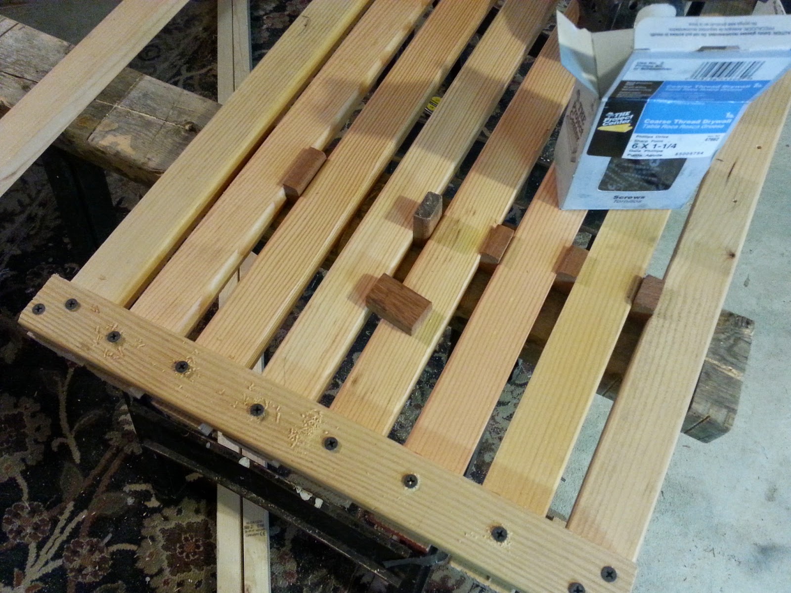 | Test fit is excellent. If it werent so damned cold, I would take a nap. the little space heater doesnt do much. Small wedges will be put on the floor to hold it in place when in the down position. While the saw was set to rip 1.5" boards, I ripped a 10 foot 2X6 for the stock to make the sprits. These will probably warp. If so, will go to laminating or birdsmouth for these parts. |